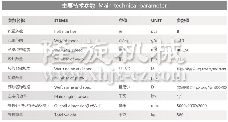產(chǎn)品概述:XH8-30型防漏條編織機(jī)主要用于編織集裝袋用防漏條、鞋帶、提包帶等。并根據(jù)防漏條的特點設(shè)計了專用卷繞機(jī)。